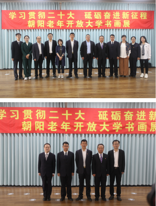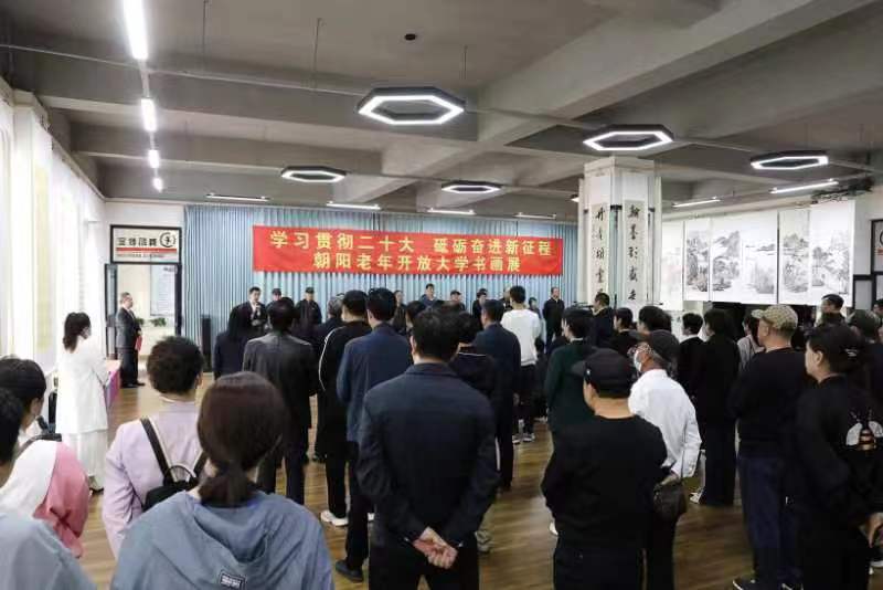 为贯彻落实党的二十大精神,进一步提高老年大学办学质量,展示老年教育成果和学员风采,推动老年大学建设快速发展,弘扬健康向上的书画艺术,朝阳老年开放大学“学习贯彻二十大,砥砺奋进新征程”书画展开幕式于5月12日隆重举行。本次活动由辽宁省社区教育指导中心和朝阳开放大学联合主办,由朝阳老年开放大学承办。朝阳市人大常委会副主任张顺兰,朝阳市政协副主席付武臣,原朝阳市人大常委会副主任、市老年人体育运动协会主席韩军,原朝阳市人大常委会副主任雷达,原朝阳市人大常委会副主任刘万斌,朝阳市政府副秘书长张丽新,朝阳市教育局党组书记、局长、市委教育工委副书记巨海燕,辽宁省社区教育指导中心办公室主任周志忠,辽宁省社区教育指导中心社区教育办公室主任李廓等领导,以及朝阳市大中专学校领导出席。在开幕式上,展出了辽宁省社区教育指导中心和朝阳市老年人体育运动协会的祝贺参展作品。在开幕式之前,朝阳老年开放大学模特班学员为与会人员展示了精彩的模特表演“水墨中国”,羸得了阵阵喝彩。朝阳市人大常委会副主任张顺兰宣布书画展开幕。本次活动由朝阳开放大学党委副书记、校长张文杰主持。各界人士近100人参加了本次活动。