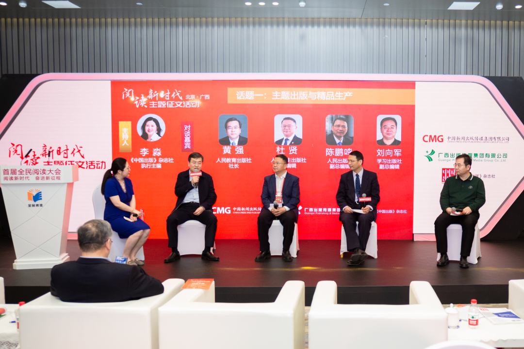 4月25日上午,首届全民阅读大会·“阅读新时代”主题征文活动在北京正式启动。中宣部副秘书长郭义强,中宣部出版局副局长李一昕,教育部社会科学司副司长宋凌云和全国政协常委、副秘书长朱永新,中国出版协会理事长邬书林,中国版权协会理事长阎晓宏,中国期刊协会会长吴尚之,中国毛泽东诗词研究会会长、中央党史和文献研究院原院务委员陈晋,韬奋基金会理事长聂震宁,中国新闻出版传媒集团有限公司党委书记、董事长马国仓等在北京会场出席启动仪式。广西壮族自治区党委宣传部副部长利来友,广西出版传媒集团有限公司党委书记、董事长覃超和总经理唐咸秋等在南宁会场出席启动仪式。启动仪式由中国新闻出版传媒集团有限公司编委会主任丁以绣、中国新闻出版广电报社副总编辑冯文礼分别主持。